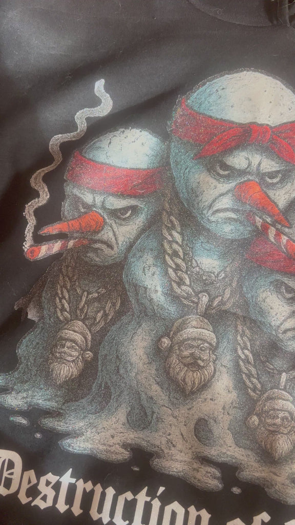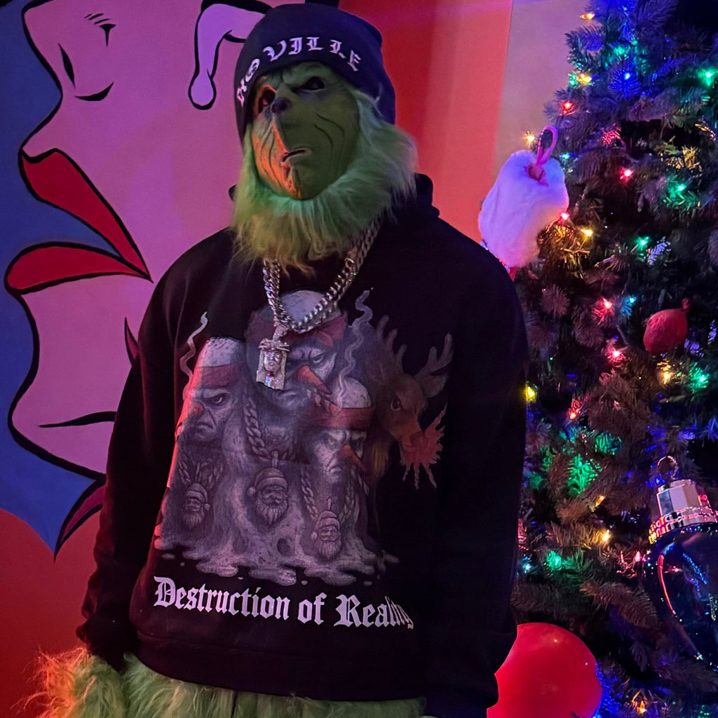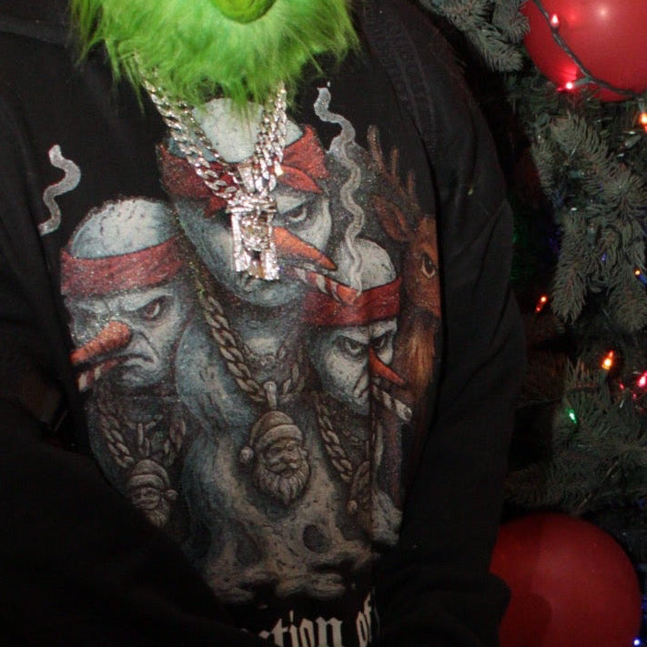 The Not Ugly Ugly Christmas Hoodie flips holiday cheer into street chaos. Set on a black heavyweight hoodie, the design features snowmen in red bandanas, posted up and smoking candy canes, iced out with Santa Claus head chains. Standing with them is Rudolph, his red beam nose hitting in a glitter finish that shines loud under the lights.